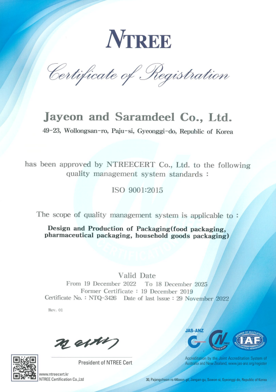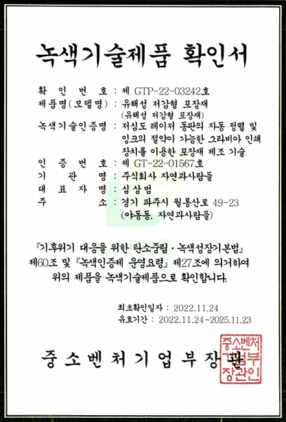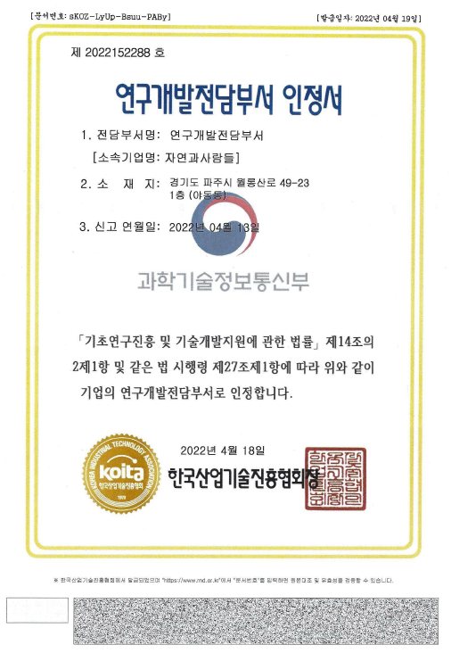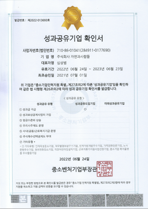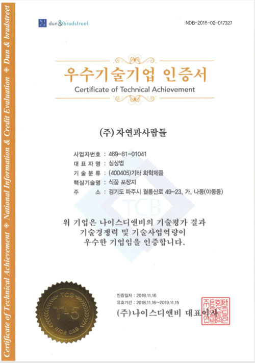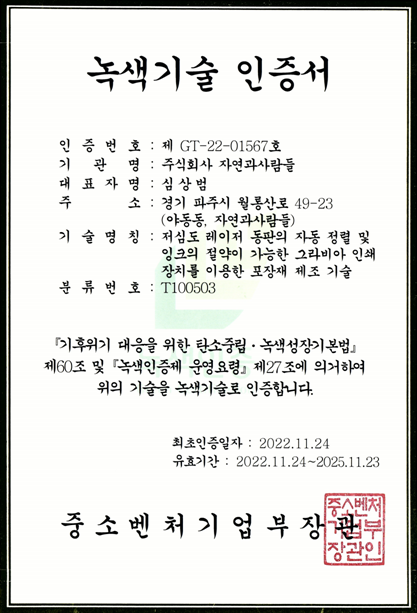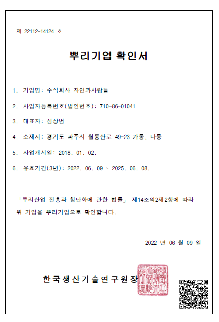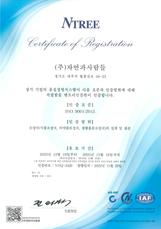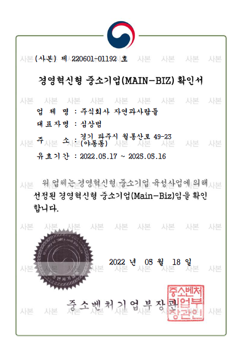 회사소개 특허·인증 와이드북 2022. 8. 8. 17:01 앤트리인증원(Ntree) 인증서(국문) 앤트리인증원(Ntree) 인증서(영문) 우수기술기업 인증서 소재부품전문기업 확인서 벤처기업 확인서 경영혁신형 중소기업 (MAIN-BIZ) 확인서 성과공유기업 확인서 뿌리기업 확인서 연구개발전담부서 인정서 녹색기술 인증서 녹색기술제품 확인서 공유하기 게시글 관리 자연과사람들 '회사소개' 카테고리의 다른 글 회사 소개 (2) 2022.08.08 인사말 (0) 2022.08.08 MOU 체결(한국항노화R&D) (0) 2022.08.08 오시는 길 (1) 2020.02.23 '회사소개' Related Articles 회사 소개 인사말 MOU 체결(한국항노화R&D) 오시는 길